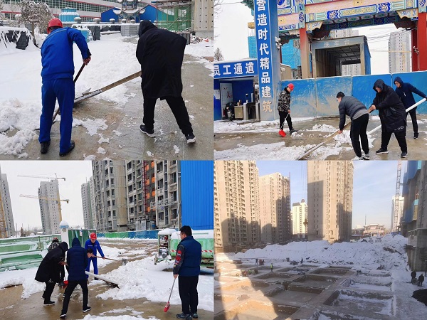由于本輪低溫降雪持續(xù)時間較長,整個施工現(xiàn)場積雪不僅厚還很瓷實,清掃工作十分困難。寒風(fēng)凜冽刺骨,但大家熱情高漲,充分發(fā)揚不怕苦、不怕累的精神,黨員干部帶頭,職工群眾踴躍參加,按照分工好的清掃區(qū)域全面鋪開進(jìn)行。設(shè)備管理員系上安全帶爬上塔吊,清理積雪,先后對各類機械設(shè)備進(jìn)行維修保養(yǎng),檢查是否存在安全隱患;電工按照巡檢路線展開防寒防凍措施檢查,并對臨電周邊積雪進(jìn)行清理;其他管理人員掃的掃、鏟的鏟、相互配合,清除辦公區(qū)及生活區(qū)積雪;在施工區(qū)域,各分包隊伍清理道路積雪,對1#、2#、6#、10#住宅樓各層采取冬季保暖措施,并對門窗逐個進(jìn)行封閉;項目經(jīng)理帶隊,加強現(xiàn)場巡護,落實落細(xì)各項安全措施,確保雪后順利復(fù)工。經(jīng)過大家一個上午的通力合作,高質(zhì)高效地完成了掃雪除冰工作,確保重點區(qū)域沒有積雪結(jié)冰,切實保障了項目有序運行。